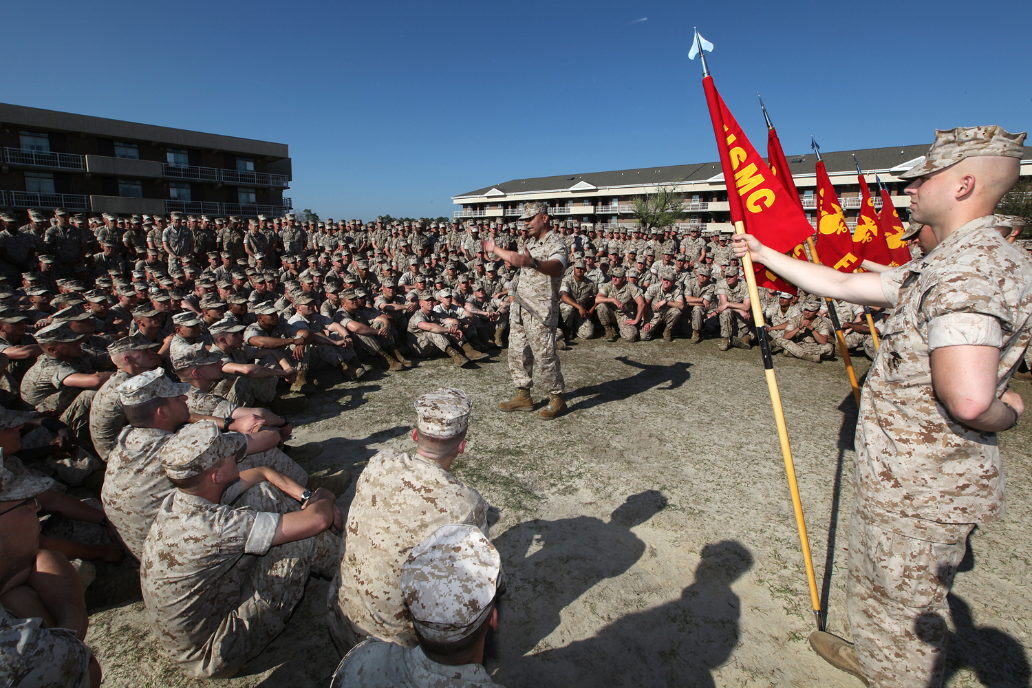 Sergeant Major Nicholas A. Deabreu, Battalion Landing Team, 2nd Battalion, 2nd Marine Regiment sergeant major, speaks to the “Warlords” following a post and relief ceremony aboard Marine Corps Base Camp Lejeune, N.C., March 18, 2011. Deabreu relieved Sgt. Maj. William E. Heyob during the ceremony. The Marines and sailors of the 22nd MEU are currently deployed with Amphibious Squadron 6 aboard the USS Bataan Amphibious Ready Group and will continue to train and test the MEU’s ability to operate as a cohesive and effective Marine Air Ground Task Force. The 22nd MEU is a multi-mission capable Marine Air Ground Task Force comprised of Aviation Combat Element, Marine Medium Tilt Rotor Squadron 263 (Reinforced); Logistics Combat Element, Combat Logistics Battalion 22; Ground Combat Element, Battalion Landing Team, 2nd Battalion, 2nd Marine Regiment; and its command element.